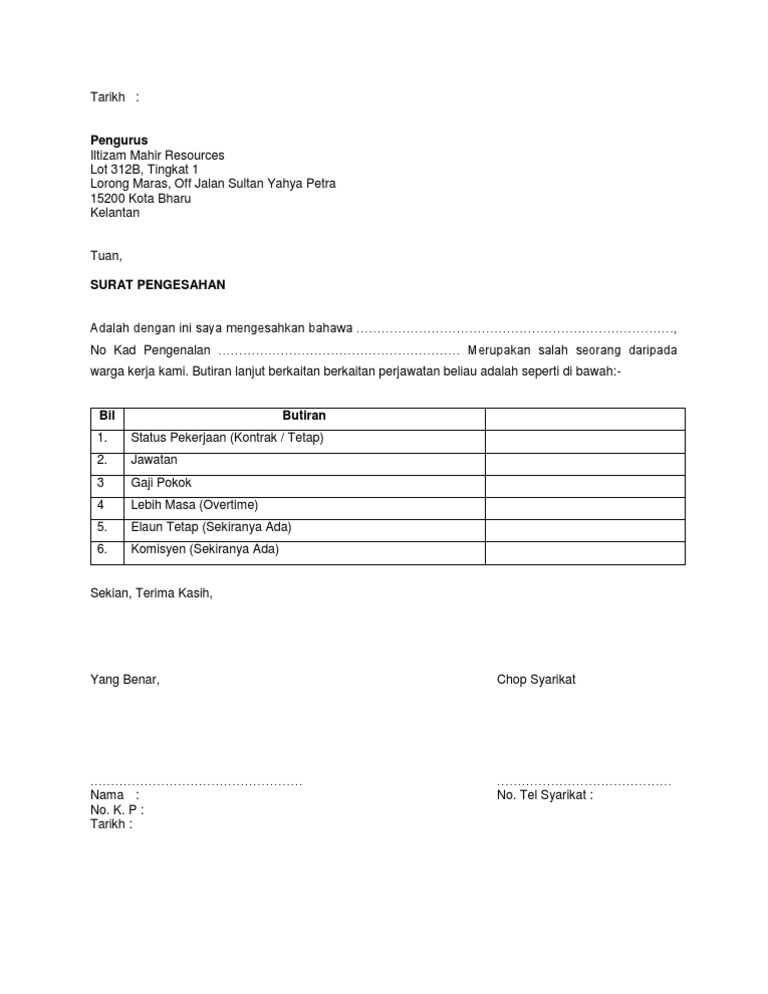 Use the download button below or simple online reader. Contoh surat pengesahan majikan english. Borang permohonan surat pengesahan untuk membuat pinjaman atau menjadi penjamin institusi kewangan luar spm pindaan maklumat pemohon peminjam penuhkan penjamin. Sample confirmation letter for interview. Dibawah saya sediakan contoh surat pengesahan majikan yang terbaik. Jika anda ingin membuat pinjaman (loan bank) dan membeli rumah, pihak bank pastinya inginkan surat pengesahan majikan sebagai bukti anda bekerja dan ingin melihat. Dengan sesungguh dan sebenarnya mengaku bahawa: This page is about contoh surat pengesahan majikan,contains contoh surat rasmi kepada perkeso,latihan industri fuu: All formats available for pc, mac, ebook readers and other mobile devices. Surat pengesahan pendapatan daripada majikan atau akuan bersumpah daripada pesuruhjaya sumpah … Surat pengesahan pekerjaan sering diminta oleh agensi luar, seperti tuan tanah atau kreditur pekerja. Pengesahan majikan bagi program penggajian dan penempatan semula pendatang asing tanpa izin (pati)dengan segala hormatnya saya merujuk kepada perkara tersebut di atas. Ingin memohon pinjaman atau memohon perkerjaan yang mana memerlukan anda mendapatkan salinan surat pengesahan dari majikan untuk mengesahkan butir maklumat anda sepanjang berkhidmat.