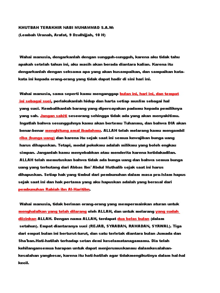 Khutban ini disampaikan pada 9 zulhijah tahun. Khutbah terakhir nabi muhammad saw ketika haji wada' di lembah uranah, gunung arafah. Intipati khutbah terakhir yang pernah dikumandangkan oleh baginda rasulullah saw. Renungkanlah kehidupan kits sebelum kembali kepada pencipta. Membebaskan semua hamba sahayanya, dan menghibahkan seluruh peralatan perangnya kepada.