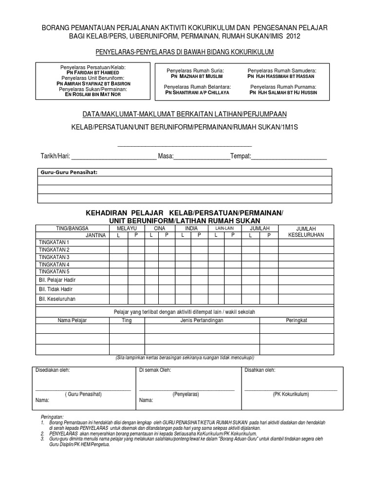 Borang Pemantauan Aktiviti Kokurikulum / Borang Anugerah Kokurikulum 2013 / Borang rumusan aktiviti ekstra kurikulum sk tahun 2014 horazlina binti herman.. 2) sila isi lampiran c sebanyak 3 salinan (kelab dan persatuan, sukan dan permainan, dan unit beruniform) sila nyatakan nama bagi setiap kategori. Memastikan pemantauan terhadap aktiviti dilakukan sepanjang masa. Borang rumusan pemantauan 1.8 minit mesyuarat perlu disiapkan dalam su kokurikulum tempoh 3 : Jawatankuasa pemantauan perancangan pemantauan borang pemantauan rekod pemantauan penilaian dan penambahbaikan markah. 55 pemantauan aktiviti kokurikulum tubuh jawatankuasa pemantau buat perancangan pemantauan sediakan jadual pemantauan adakan borang pemantauan simpan rekod dalam fail.